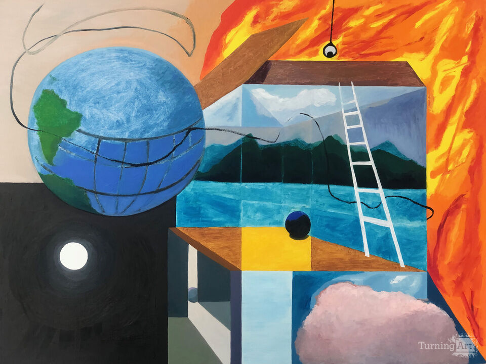 Immobile is a surrealist painting juxtaposing calm waters and mountains with flames, suggesting wildfires and the climate crisis that the landscape belies. A thin line from the globe signifies pollution and the forces at play that we don’t always see. The title refers to the way policy can resist change and how we can feel frozen in the face of calamity.
