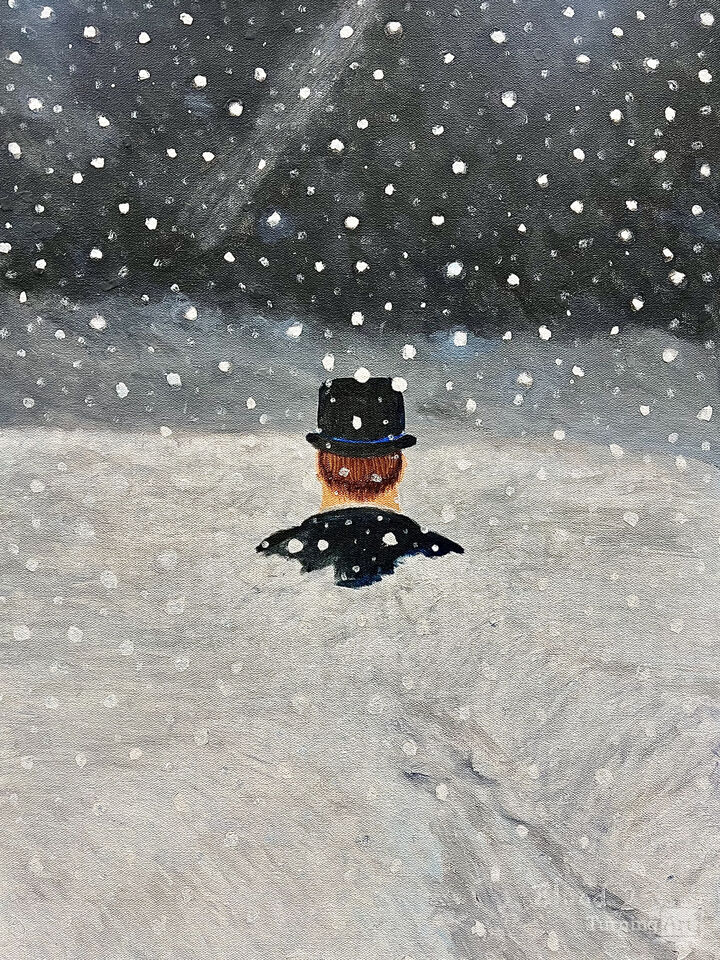 I poured my emotions into this acrylic painting, capturing a surreal moment of isolation and reflection. The falling snow symbolizes both beauty and the overwhelming quiet that surrounds us in solitude. The man in the bowler hat, lost in the expanse, invites viewers to explore their own feelings of being engulfed yet strangely serene. There is a sense of solitude to this and with the man facing towards the falling snow, you're somehow in it with him. How he got in this predicament is a mystery. But even though he's in deep, you somehow know he'll be all right – after all, it's just a painting! This piece will bring a mysterious, thought-provoking energy to your space, stirring deep contemplation.