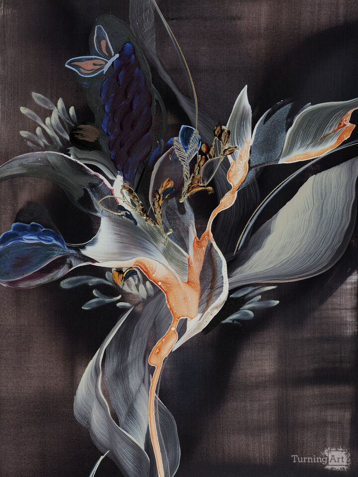 Working primarily in acrylic and mixed media, she builds compositions that appear weightless yet intentional — each curve and motion a conversation between spontaneity and control. Her process is both intuitive and highly refined: she begins without rigid sketches, allowing gestures to emerge organically, guided by sensation and internal rhythm. Then, with precision and restraint, she edits, layers, and refines — integrating subtle details such as metallic leafing, translucent glazes, or dry-brushed textures that catch light and change throughout the day. This dynamic interplay between flow and stillness, chaos and harmony, becomes the essence of her aesthetic.