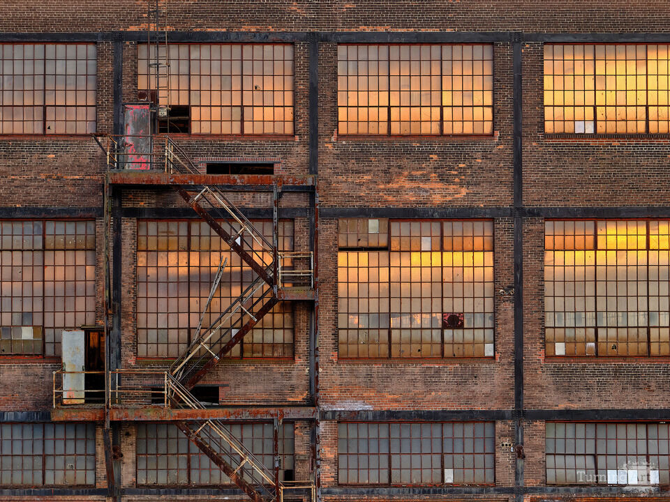 Sunset filters through the glass at one of the many Industrial Revolution brick factory buildings at the Bethlehem Steelworks