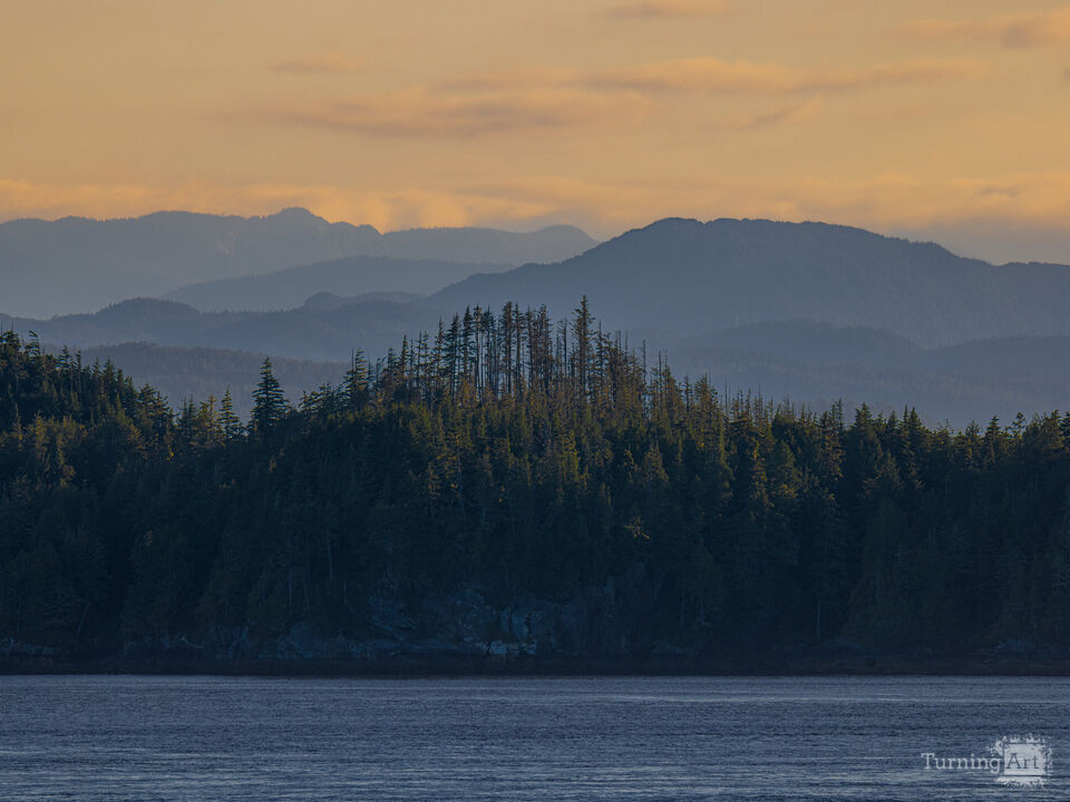 A serene coastal landscape showcasing a scene from the Inside Passage. A forested island against the backdrop of layered, misty mountains, softly illuminated by the warm glow of a rising sun. The tranquil water in the foreground provides a sense of calm and balance to the composition.