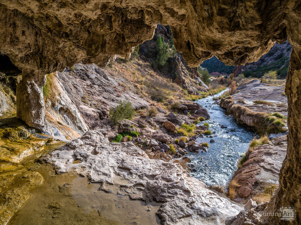 View of the Jemez River from inside the Soda Dam in the Jemez Mountains of New Mexico. The Soda dam is a mineral concretion that is being deposited by hot springs water bubbling up to the surface. Water is a rare commodity in the Southwest, and offers a refreshing relief from the dry desert country. The winter snows and summer rains make life possible.