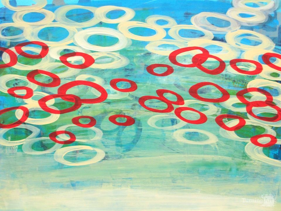 Inspired by underwater bubbles and clear blue-green waters. The colors create a sense of calm and ease, with a bit of edginess in the red circles.