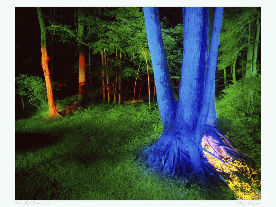Later, as the sun was setting, I would carry my backpack, filled with 90 lbs. of large-format photographic equipment, to the exact coordinates and prepare for my all-night shoot. What began as an adventure gradually transposed into an earnest study of the lives of the forest trees. All photographs were made in complete darkness with a wide variety of filters and light sources. I began to challenge myself by creating a week's worth of night shoots on a single piece of 5×7 sheet film. In 2002, I expanded my objectives to create images based on up to fourteen nights of shooting on only one sheet of film. The complexity of these images challenged me to the point where I felt that I had reached my maximum capacity for performance in this endeavor.