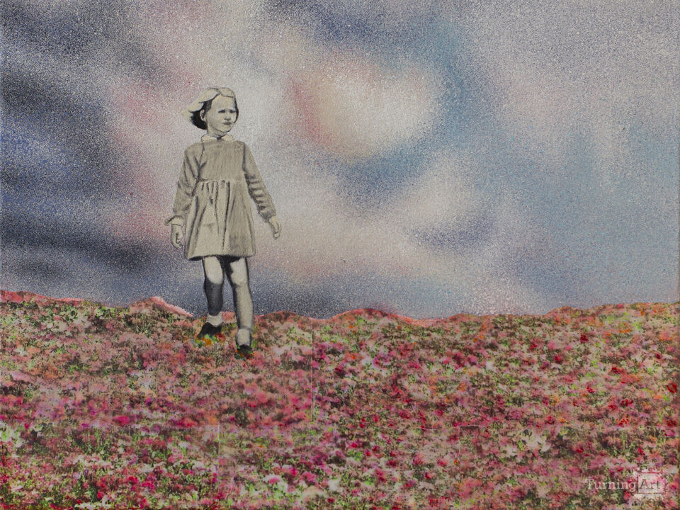 In landscape art 'IT COLORS YOUR EYES'", a girl reminiscent of an old sepia-coloured photograph walks through hills decorated with dazzling pink, red and orange flowers. The spring flowers provide a vivid contrast to the girl's subdued, vintage look, while looming clouds gather above and behind her, adding depth and drama to the scene.