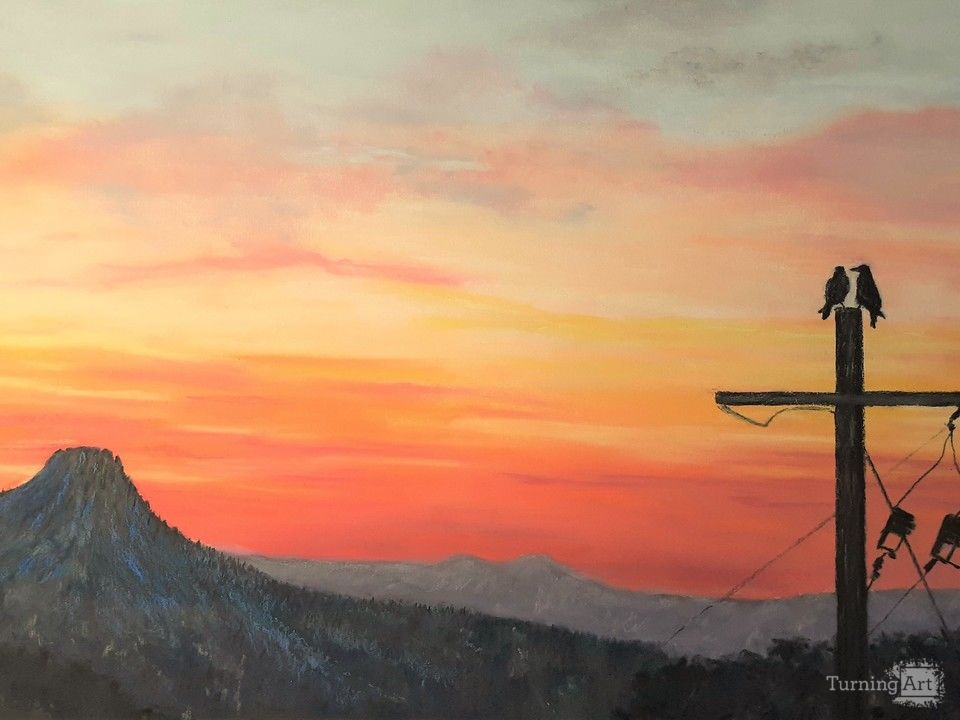 Two Ravens meet at sunset to share the details of their day. Thumb Butte and another glorious Arizona sunset complement the scene.