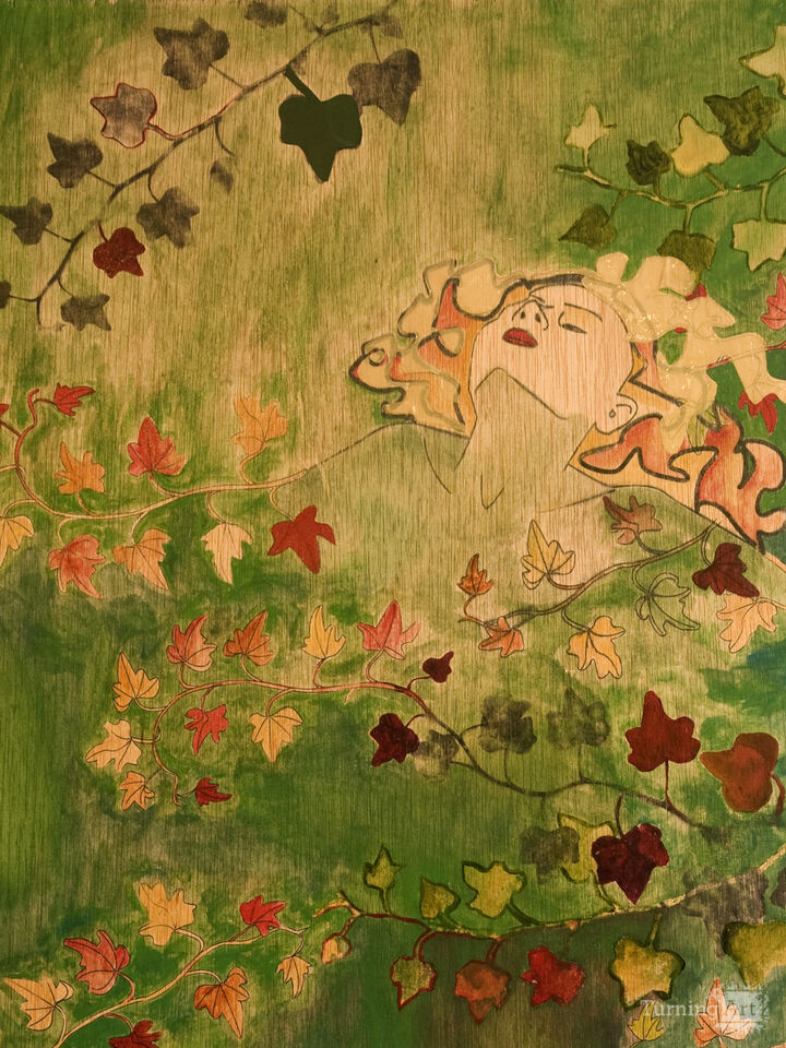 Ivy lady was created with mixed media on birchwood. Using transfer markers to transfer a digital drawing I created, onto the wood, then oil paints and stains were applied, as well as cut out paper that was glued to the wood.