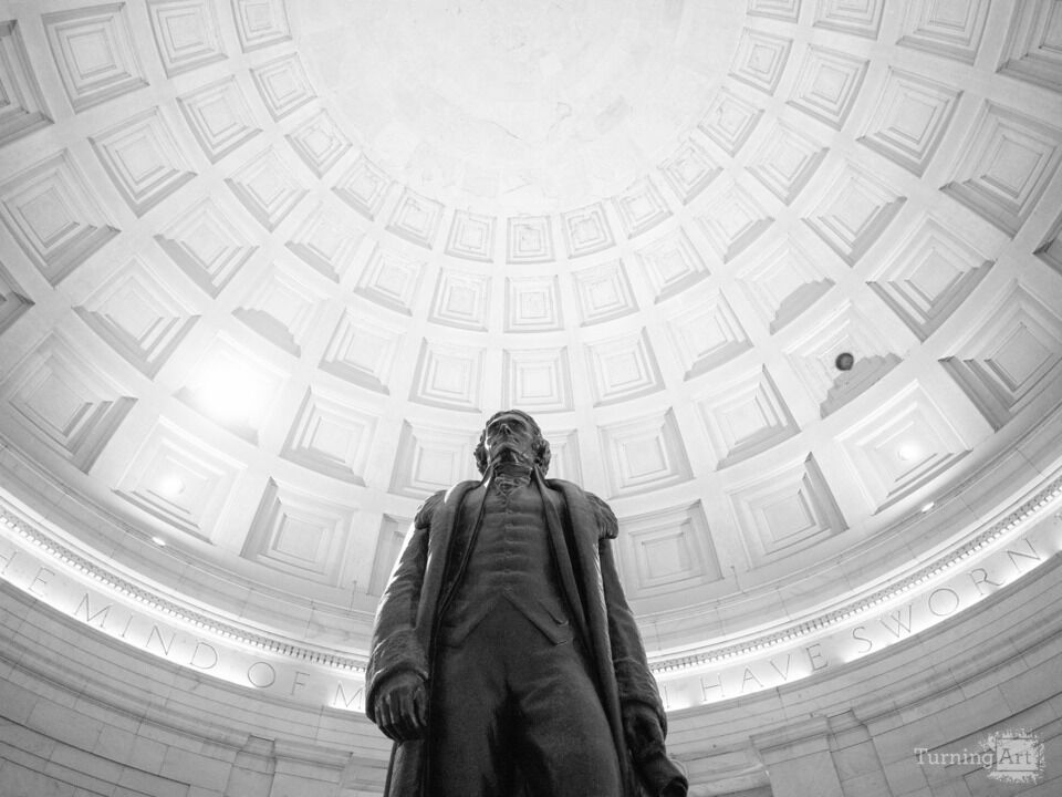 Jefferson Memorial statue and dome, Washington, D.C. Black and white photograph showing a low-angle view of the statue against the coffered ceiling.