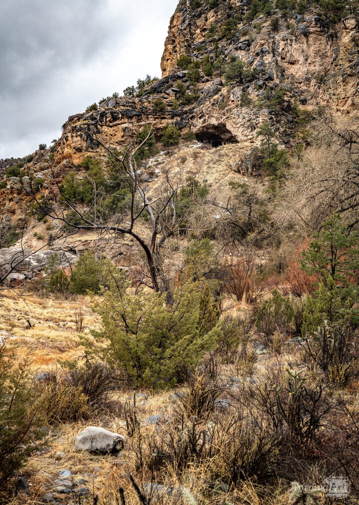 The southwest has been home to humans for thousands of years. Clouds replace the usual blue sky over Jemez Cave, a prehistoric site in the Jemez Mountains. The cave may have been occupied by early farmers as early as the mid-to-late Archaic period (ca. 1000 BC).