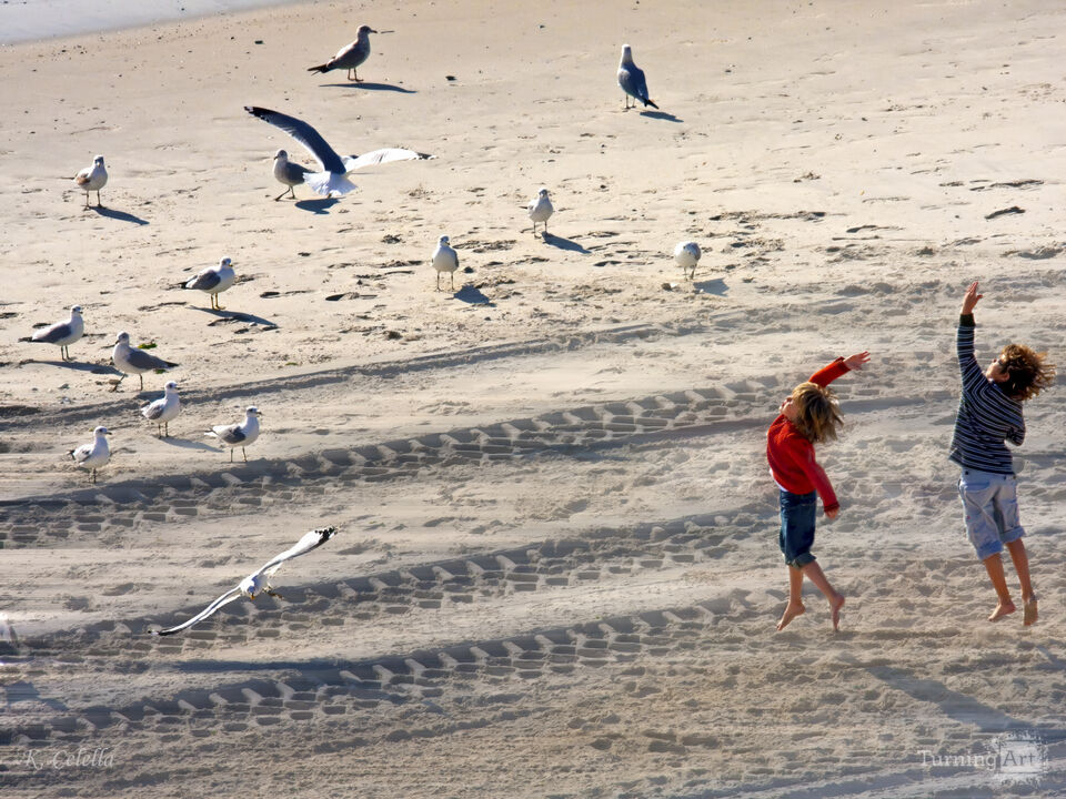 Children on the beach, playing with the seagulls are jumping for joy!