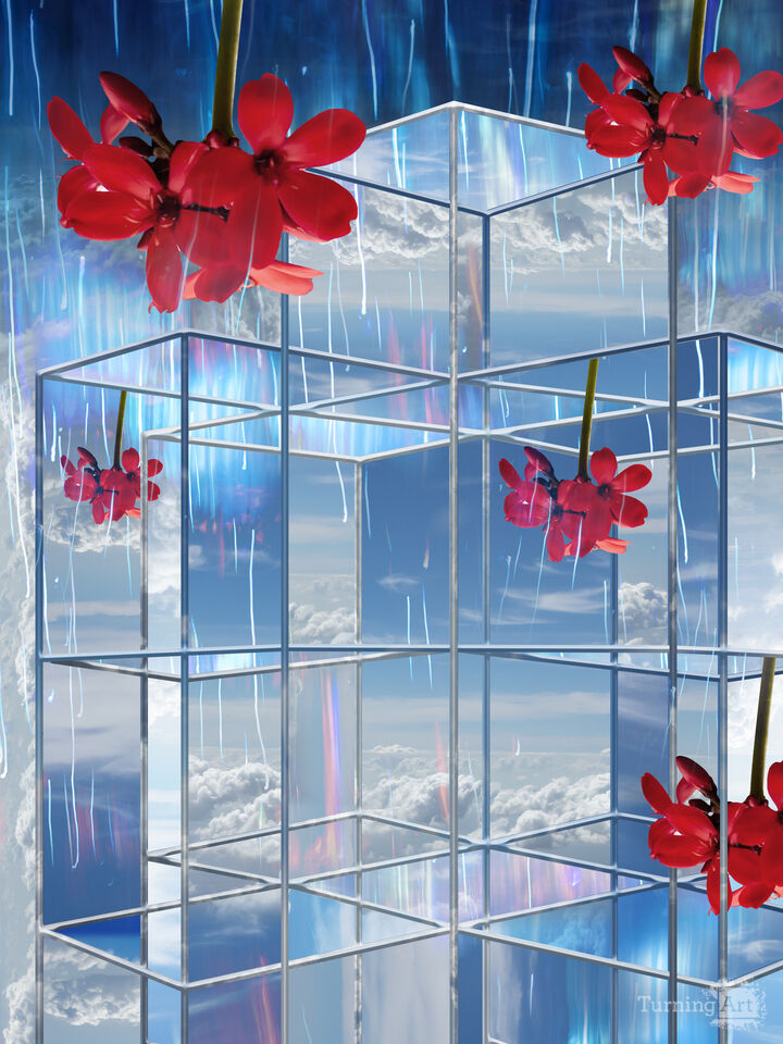 Blooms drift through through skies, weightless and radiant. This piece rests in the space between surrender and joy, Delicate details hover just out of reach—teasing how close the intangible really is.