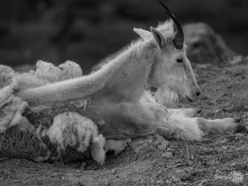 The iconic Mountain goats at Mt. Blue Sky, have been photographed for many years. I've tried to capture a different view of these beautiful, but feisty creatures. This capture is different, because the goats are usually captured while trying to flee humans. I wanted to capture some moms just resign while keeping watch on the babes. Also the black and white processing seems to enable the viewer to focus in on the softness and undisturbed moment.