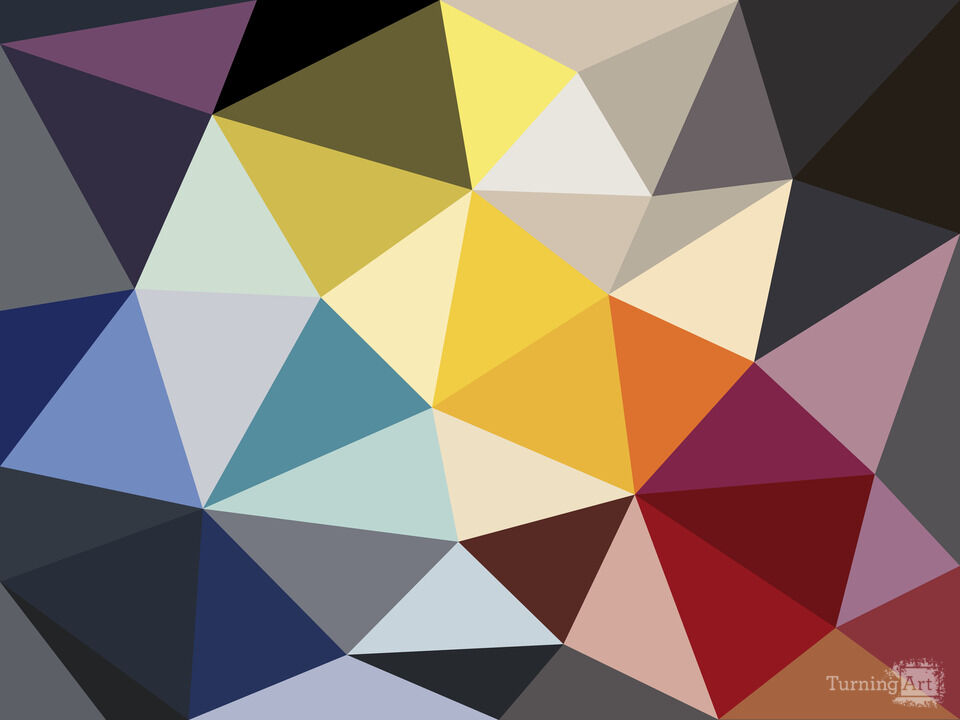 "Kazuma" (Harmony) features origami-style triangles in mustard yellow, cream, teal, red, and charcoal fit together in a rich, earthy mosaic, blending warm tones with subtle contrast.