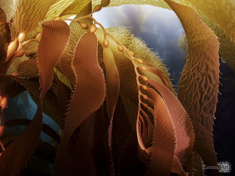 An overcast day in a kelp forest off Catalina Island. I used a fisheye lens to create the sensation of being inside these kelp fronds while peering into the murky water beyond.