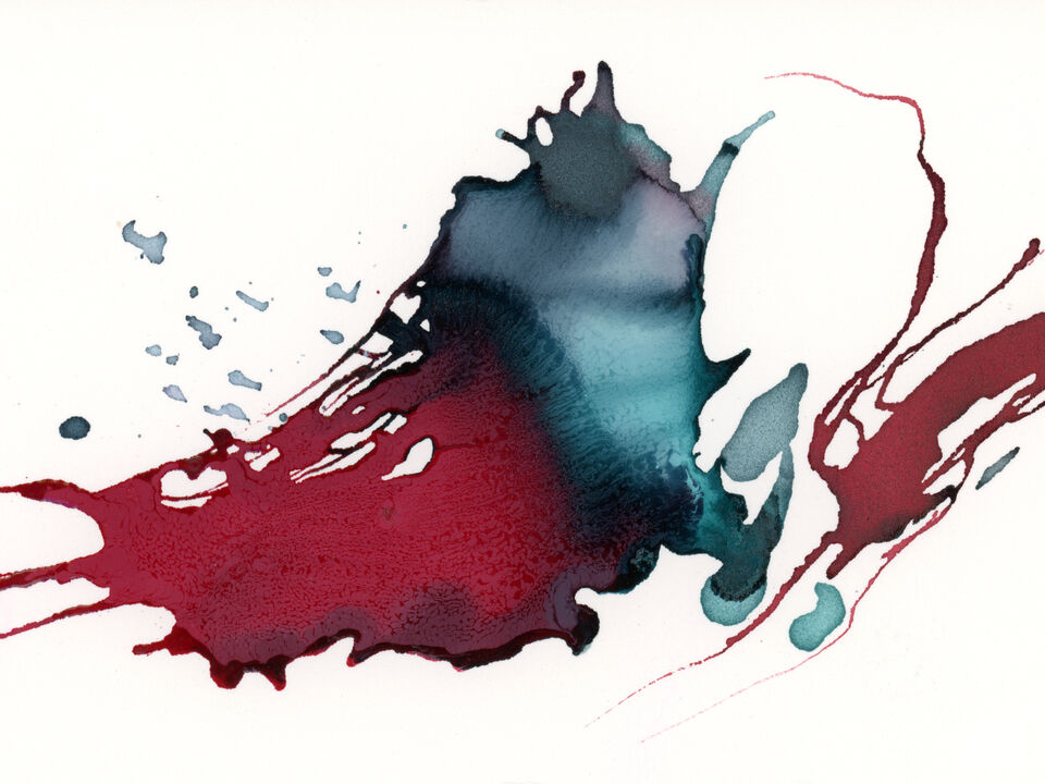 Vibrant splashes of red and blue blend together on a white background. Abstract shapes and soft gradients create a fluid, dynamic composition. For this series the inks were applied to oil painting paper which allows the ink to stay on the surface without diffusing. I hope you enjoy it and thanks for looking!