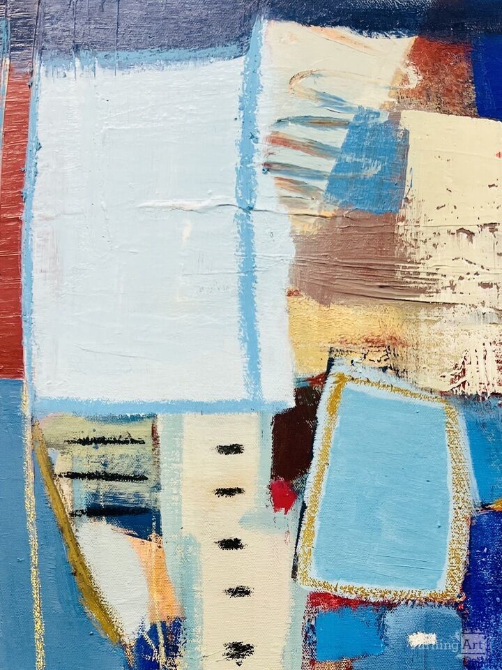 This captivating abstract painting captures the rhythm and texture of city life through layered geometric forms and bold colors. Shades of blue, beige, and rust interact with textured elements like grids and streaks, evoking the structural complexity of urban landscapes. The juxtaposition of soft, blended tones with sharp, linear details suggests both movement and stability, as if the painting itself is alive with the energy of a bustling cityscape. Perfect for modern spaces, this artwork invites viewers to explore its depth and discover new details with every glance, making it a timeless addition to any collection.