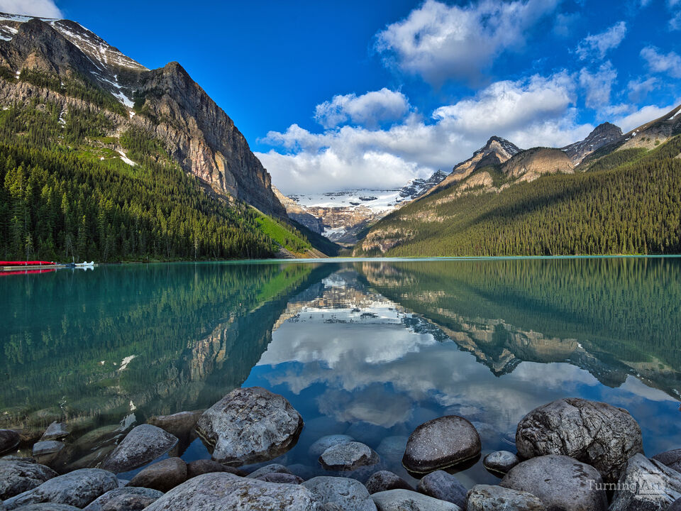One of the most photographed locations in all of the Canadian Rockies is Lake Louise. The trick is getting there on a prefect morning before the crowds. This calm sunny day helped to produce beautiful reflections across the lake.