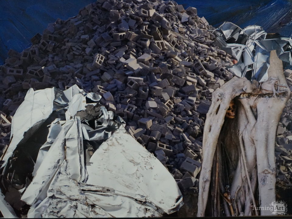 The intersection of industrial remnants, architectural elements, and household objects form a fantastic landscape.