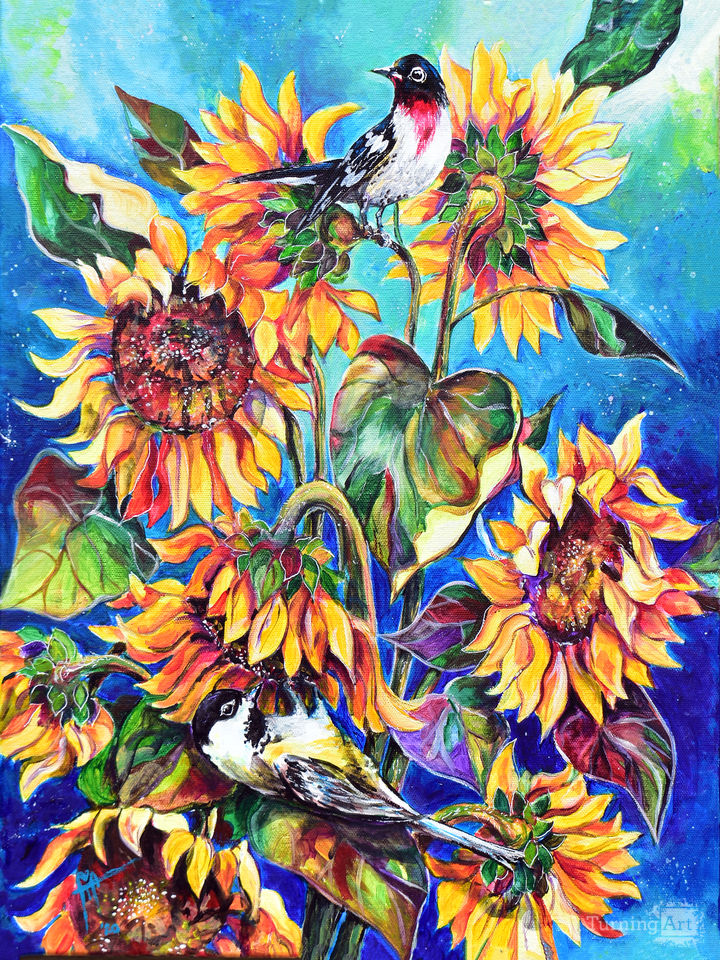 The birds are enjoying the heavy sunflowers full of seed and sun. This painting was inspired by the incredible fields of sunflowers located all of the front range of Colorado, where the artist lives.