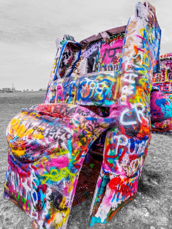 This selective color vertical photograph I captured is another colorful perspective of Cadillac Ranch, one of the most recognizable roadside art installations in the American Southwest. Standing along the open plains near Amarillo, the row of classic Cadillacs remains buried nose-first in the ground with their tailfins rising toward the sky. Installed in 1974 and featuring models from 1949 through 1963, the cars were originally placed as a bold piece of public art, but over the decades they have transformed into a constantly evolving canvas shaped by travelers passing through the Texas Panhandle. For this version, the cars are in color while the background is black and white.