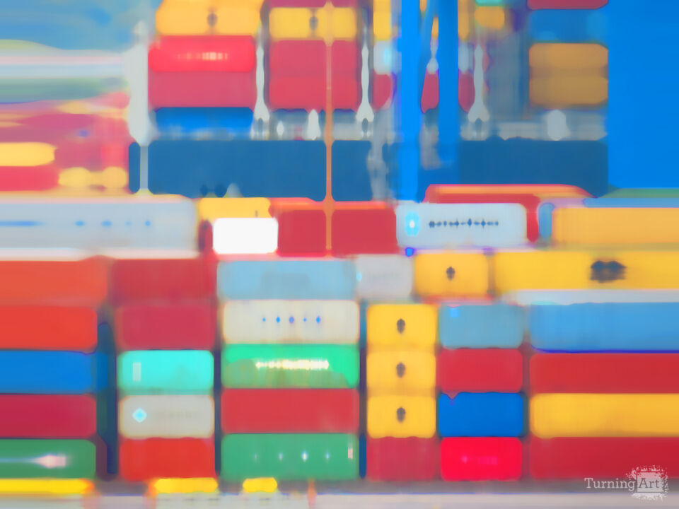 Based on my original photograph taken in Europe in 2019. These giant metal boxes, stacked high on the deep blue sea, silent voyagers in the world of trade.