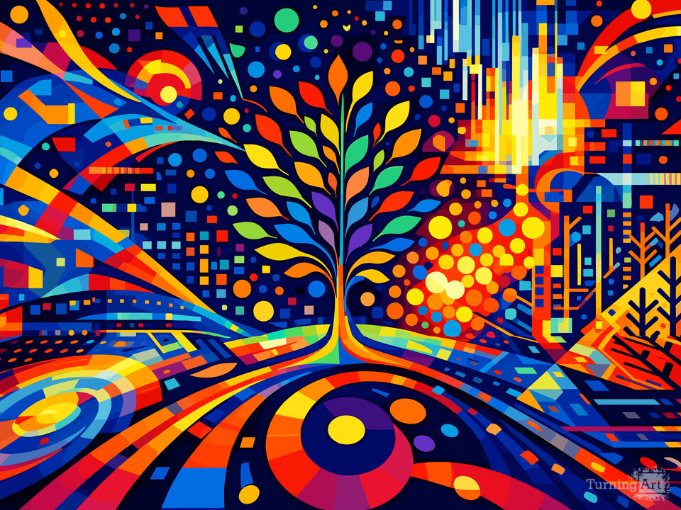 A radiant geometric tree rises at the center of a vibrant, abstract landscape where flowing ribbons, glowing city structures, and constellations of colored shapes converge into a dynamic visual ecosystem. The composition pulses with energy and motion, symbolizing the interconnected growth of nature, technology, and human creativity through bold color, precise geometry, and rhythmic patterns. šš³