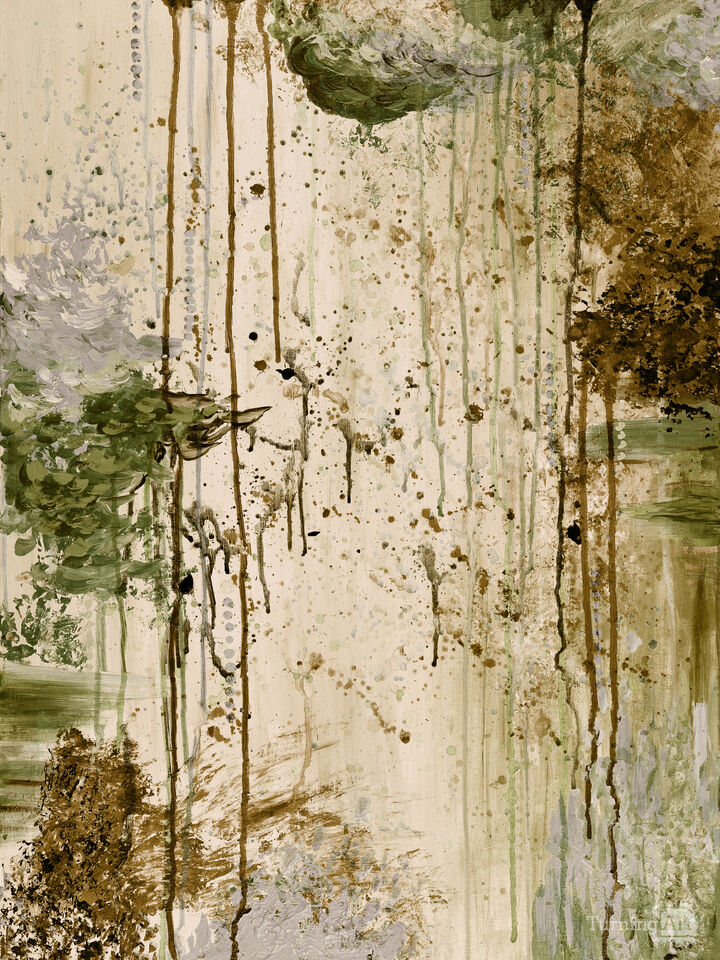 This piece is inspired by the beauty of the atmospheric, rainy skies of the Pacific Northwest, where I live and paint, finding endless inspiration from Nature. This painting is a compilation of an original acrylic painting and digital effects achieved through Photoshop to create the atmospheric and elegant final effect. It is both gestural and expressive, with organic, painterly brushstrokes and drip effects throughout. This piece is also available in an array of alternate colorways and saturation levels to suit varied décor palettes and requirements.