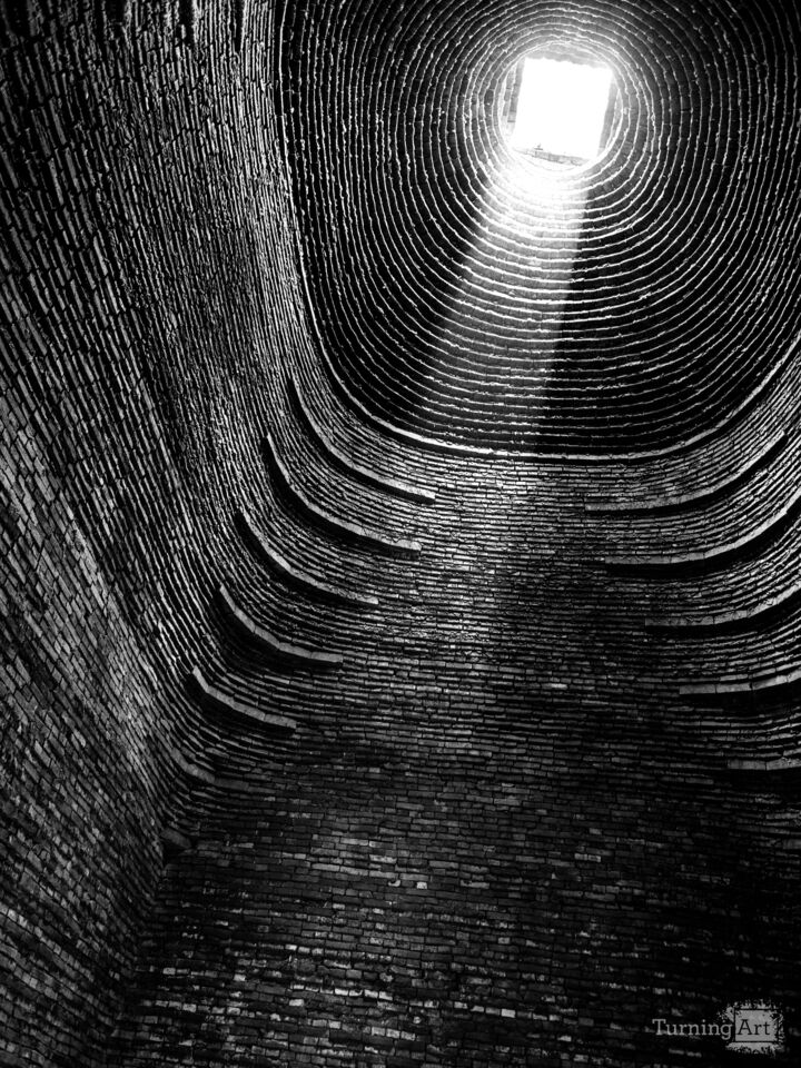 Shot from the floor of a historic brick silo, this hypnotic black-and-white image looks straight up through a spiraling tunnel of concentric brick rings toward a small rectangle of brilliant white light at the apex. The rhythmic pattern of the hand-laid bricks creates a powerful centripetal pull toward the light above, drawing the viewer's eye irresistibly upward. The contrast between the dark, textured brickwork in the foreground and the luminous opening above gives the image a deeply spiritual, almost transcendent quality — evoking themes of aspiration, hope, and the journey from darkness to light. This is a bold architectural and conceptual image that rewards contemplation.