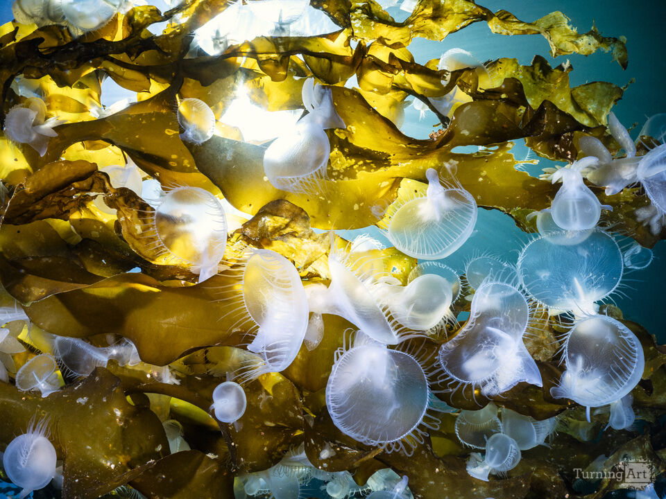 Several Lion's Mane Nudibranchs cling to kelp in the shallows around Vancouver Island. Every Autumn, millions of these gastropods inhabit the coastal waters of the Pacific Northwest.