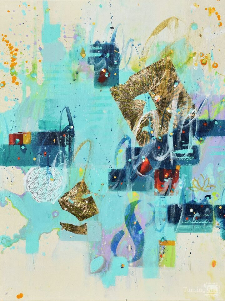 This painting is inspired by themes of freedom, self-trust, and the conscious choice to follow one’s own path. The Flower of Life collage element appears as a symbol of healing, protection, peace, and interconnectedness. The number eight symbolizes abundance, renewal, and balance signifying growth and new beginnings. Collectively, these symbols point toward a search for truth and a deeper understanding of life.