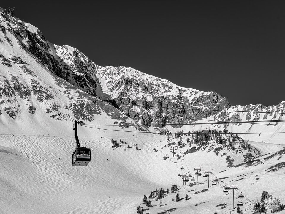 The tram at Big Sky captured in mid-ascent, suspended between the sheer rock face of Lone Peak towering above it and the snow-covered ski slopes below. Shot in black and white, it has a timeless quality — just the tram, the mountain, and the particular joy of a clear winter day at altitude. For anyone who has stood at that lower terminal, loaded in, and felt the slight sway as the mountain begins to fall away and the anxious anticipation of the summit above — this print will take you straight back. Every single time.