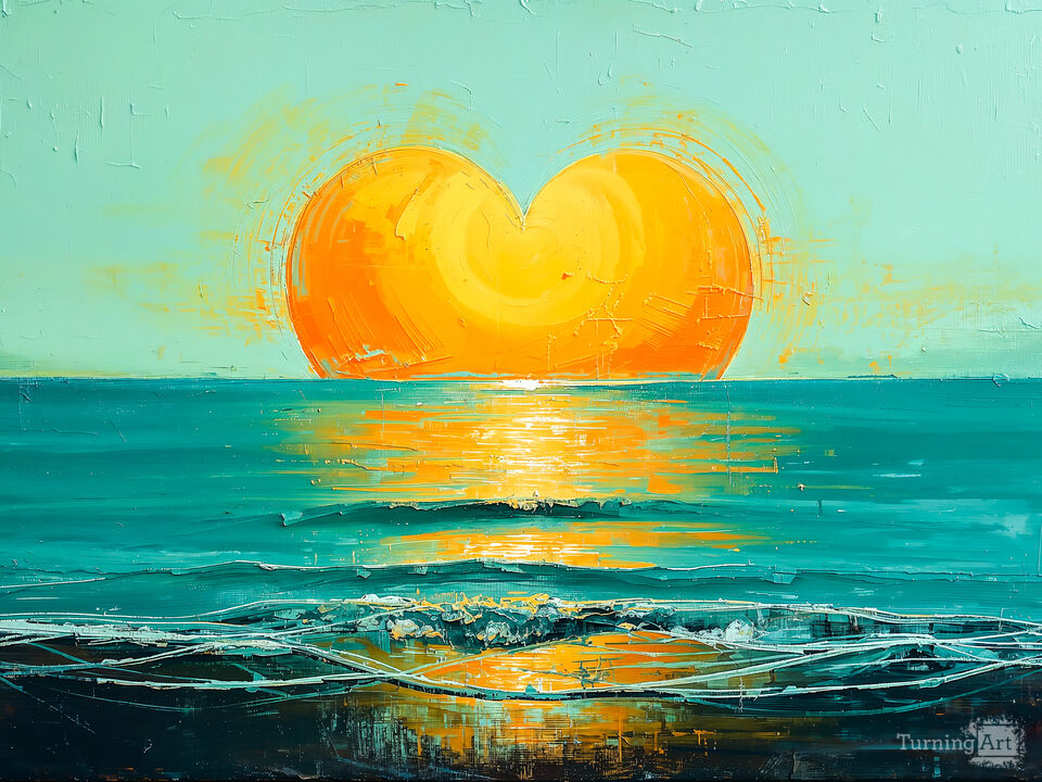 A heart-shaped sun sets over the ocean, casting warm reflections on the water. Waves gently lap at the vibrant shoreline. Created with AI plus additional editing in a modern painting style.