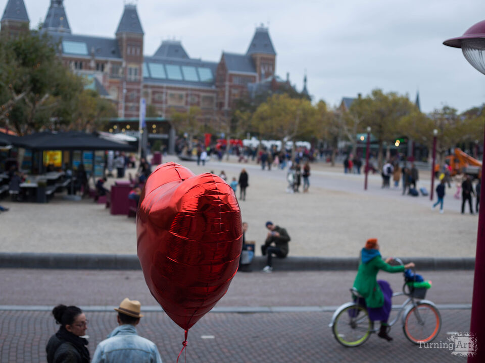 This photo feels whimsical and romantic to me. Drawing in the simplistic pleasures of life; balloons, socialization, bright colors, partnership, and the unnoticed intricacies of daily life. This scene from near Amsterdams art museum captures so much in one small instant.