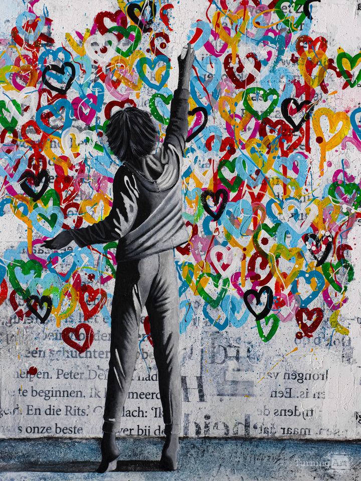A girl creates a graffiti painting with colorful hearts on a gray, drab concrete wall. She wants to brighten up the gloomy city she lives in and show that more love is needed in the world.All my artworks are inspired by weathered walls with posters, peeling paint and all kinds of things in decay.I try to use these elements to create something new, something beautiful.