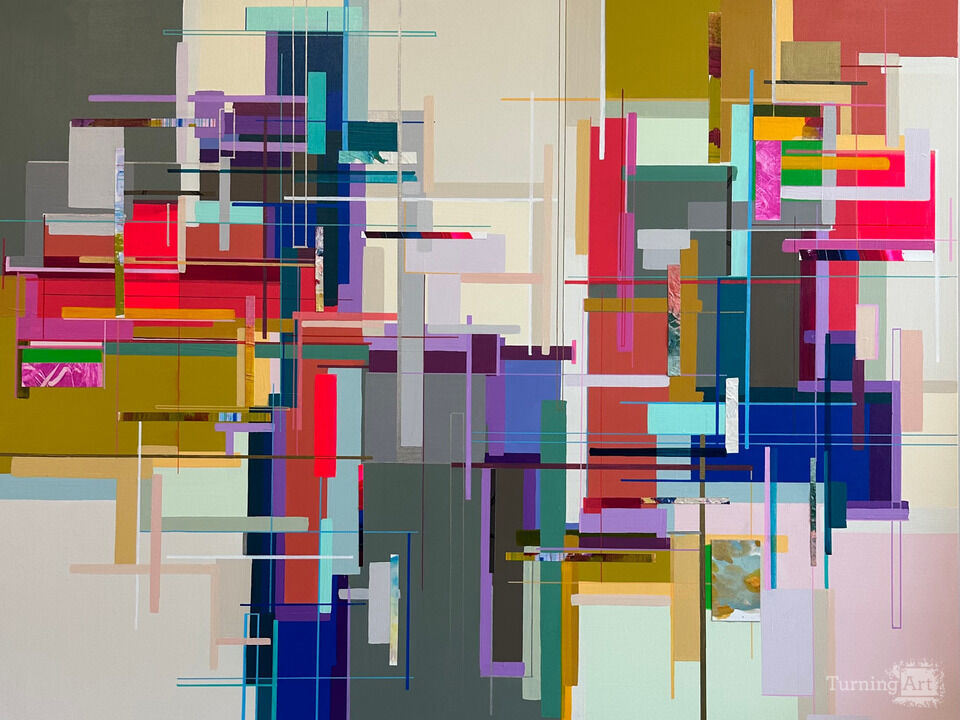This painting is part of the artist’s Building Blocks series, which explores structure, rhythm, and balance through layered geometric forms. Intersecting lines and overlapping planes of color create a dynamic sense of depth, referencing architectural space and urban movement. The palette combines bold, saturated hues with softer neutrals, allowing moments of intensity and calm to coexist within the composition. Both precise and intuitive, the work reflects the tension between order and spontaneity. It brings energy, sophistication, and visual complexity to modern interiors.