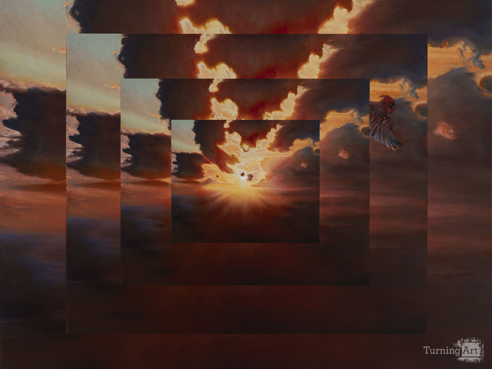 My aesthetic visualization of some such possibilities as paintings were inspired by reading about quantum loop theory in the books of Carlo Rovelli, including “The Order of Time” and “Reality is Not What it Seems.” In the series multiple versions of the same sky or multiple different skies are depicted within one image, suggesting that multiple understandings of reality could be simultaneously valid.