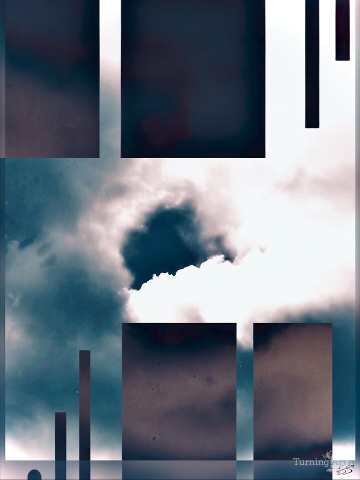 Windows on realms, worlds within worlds — this portrait juxtaposes digital graphics with sky and fingerprints.