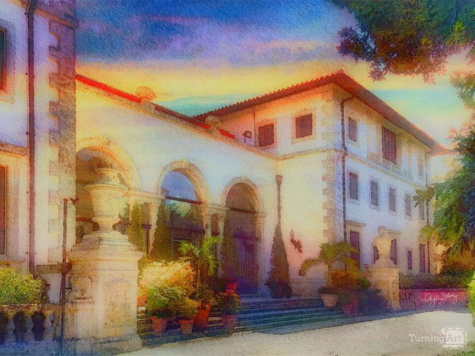 On a visit to Miami we walked though the gardens of the Vizcaya Museum. The museum was closed to the public that day but the outside was so beautiful and architectural photography is one of my favorites so it was fine with me to get these shots. I enhanced the image with color and a prismatic approach to the sky and bushes helped me portray the beauty and architectural depth of this iconic museum.