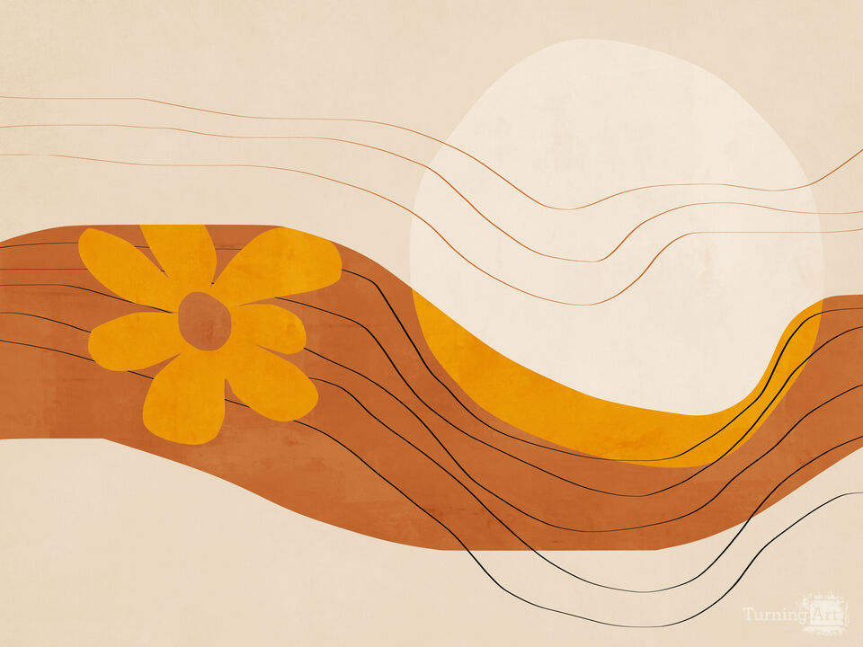 Mid Century Sunset Bloom brings an easy, retro calm to your walls with warm ochre, burnt orange, and soft cream tones. Flowing wavy bands and thin contour lines sweep across the design, while a simple daisy-like flower adds a playful focal point. This artwork works beautifully as a wall mural in a living room, dining nook, hallway, or home office, pairing well with mid-century modern and boho interior design styles.