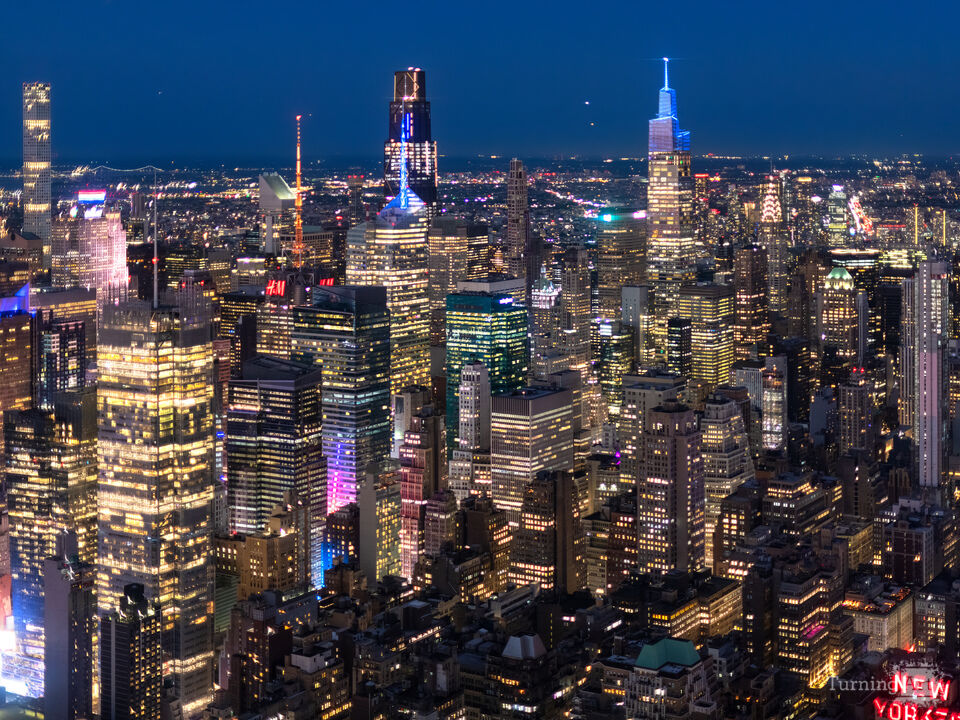 New York, NY, United States – A high angle night view shows the dense cluster of illuminated skyscrapers in Midtown Manhattan, New York.