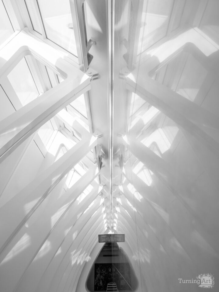 Challenge your perception of space. In this high-key architectural abstract, the boundary between the physical structure and its mirrored reflection dissolves. By aligning the camera perfectly with a reflective glass partition, Novak creates a kaleidoscopic effect where the skeletal arches of the ceiling multiply into an infinite, sun-drenched corridor.