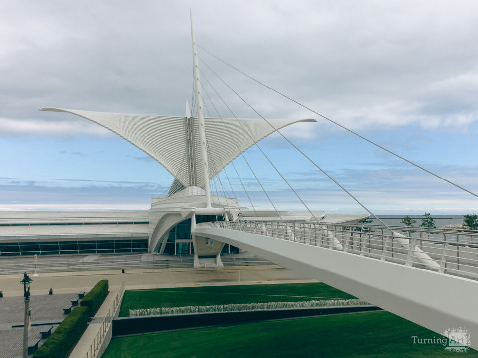 A long, curved pedestrian bridge, the Reiman Bridge, extends from the foreground to the main entrance of the building. The bridge's clean, white lines and its cables mimic the design of the wings, and its mast stands tall as a central point of the composition. In the foreground, there is a grassy area with a manicured hedge, and a streetlamp on the far left, providing a sense of scale. The entire scene showcases the museum as a harmonious blend of sculpture, architecture, and engineering, set against the backdrop of the sky and the lakefront.