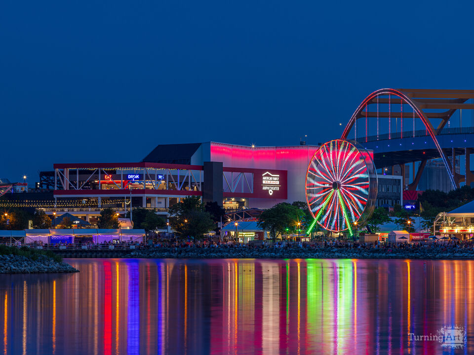 A Milwaukee summer at night, alive with Summerfest! Bright lights from the festival, including the Ferris wheel and American Family Insurance Amphitheater, reflect on Lakeshore State Park. The dazzling Hoan Bridge completes this vibrant, unforgettable scene.