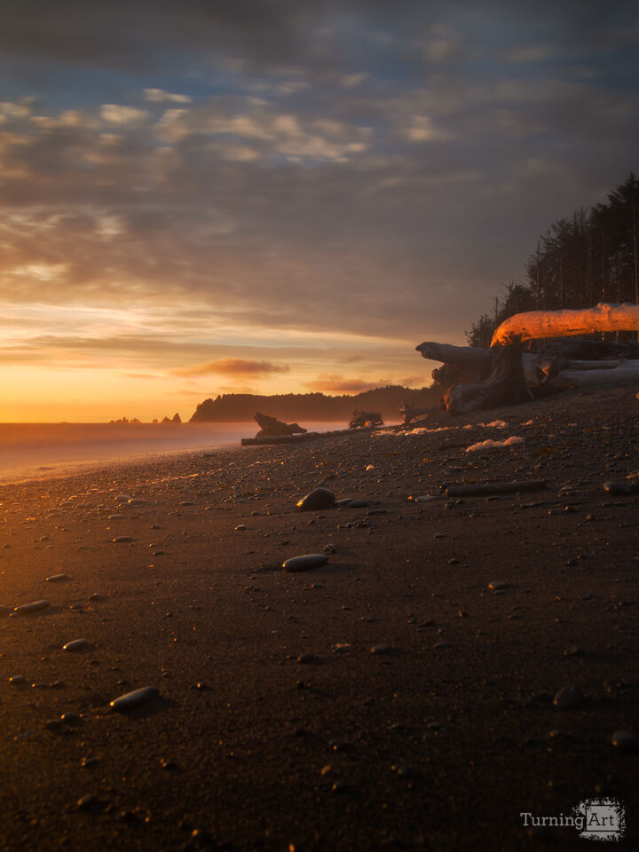 As the sun lowers over the Pacific, the air at Rialto Beach in Olympic National Park begins to shift. Cooler currents rise, drawing a soft shawl of mist over the shoreline. Moisture hangs suspended, catching and scattering the last light of the day across sand, driftwood, and sky. During these final golden minutes, light reflects off the mist itself, enveloping the beach in warm tones and long shadows. Absolutely everything glows.
