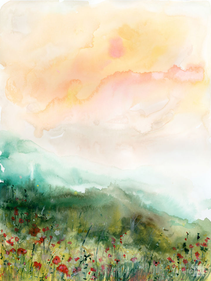 Layers of watercolor blend together to create beautiful textures that seep through the bold and bright colors forming a horizon line. Playful clouds mingle with the mountainside allowing the eye to travel far across this bright and energetic landscape.