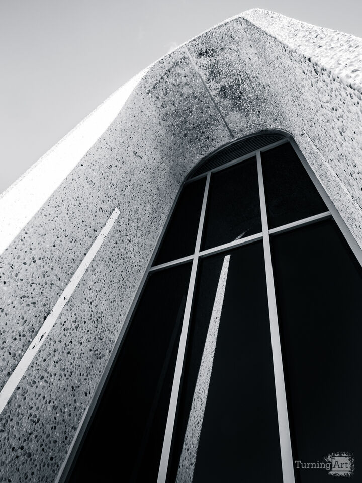 The high-contrast black and white treatment brings the intricate texture of the pebble-dash concrete into sharp relief, contrasting beautifully against the deep, obsidian shadows of the glass panes. The white mullions of the window grid cut through the darkness like light beams, providing a sense of scale and rhythmic balance to the heavy concrete form. This image is a masterclass in architectural abstraction, highlighting the bold, mid-century shapes that define this Milwaukee landmark.