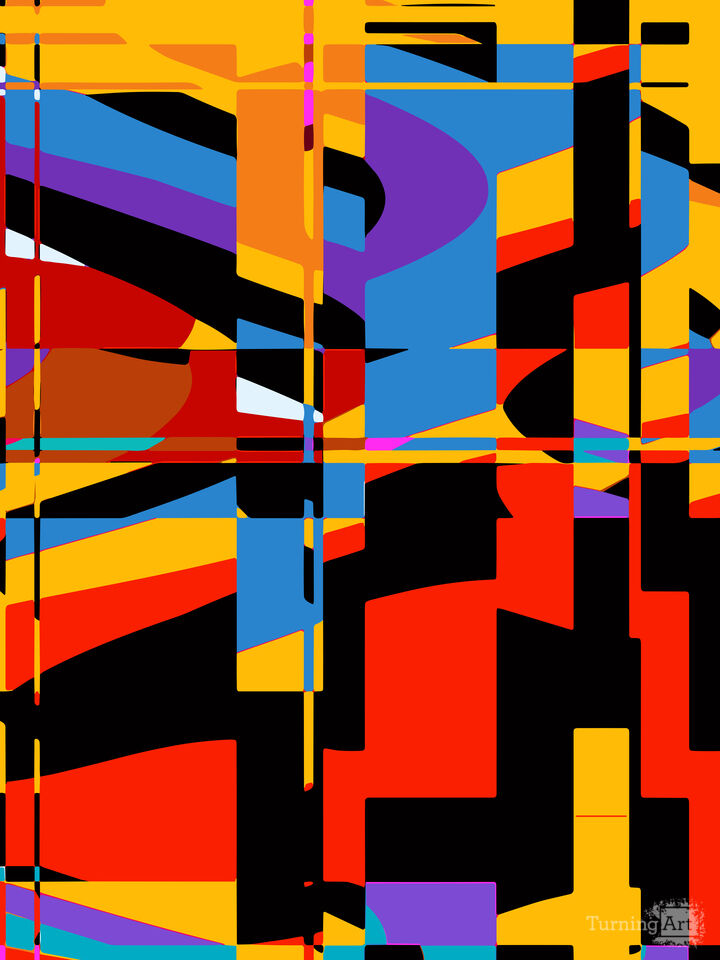 A dense field of interlocking geometric forms slices across the canvas, where bold blocks of red, cobalt blue, golden yellow, purple, and deep black collide in sharp, engineered precision. Vertical and horizontal structural lines create a rhythmic grid that fractures flowing curves and color bands, producing a dynamic tension between rigid architecture and fluid motion.