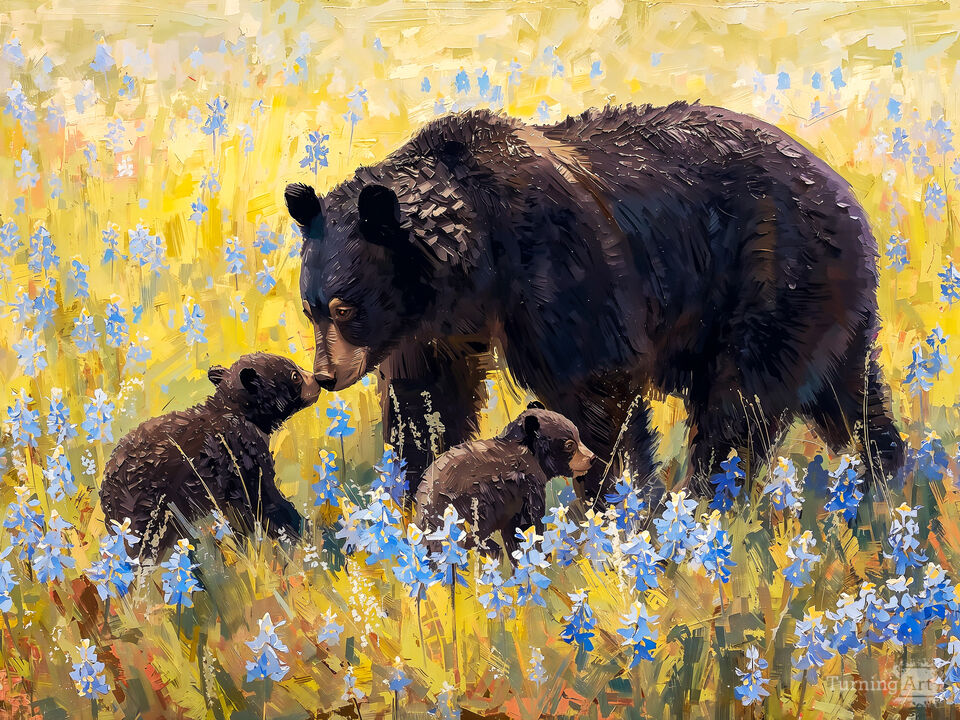 A mother bear watches over her two cubs as they explore a vibrant meadow filled with wildflowers. The sunlight casts warm tones across the scene, creating a peaceful and natural setting. Colorful and joyful art created with AI plus other digital editing in a modern painting style.