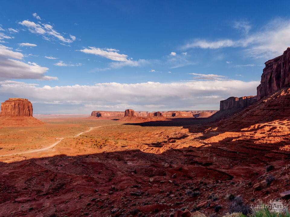 A beautiful evening in Monument Valley in Arizona as the sun drops low enough to start casting shadows on the desert terrain. To the left is the iconic Merrick Butte rock formation. To the right is part of Mitchell Mesa. In the distance you can see Elephant Butte, Cly Butte, Spearhead Mesa, Camel Butte, and more. It makes you feel like you stepped into a western movie. There have been a few movies that have actually been file here. A few clouds start to roll in just in time for a dramatic sunset that I also have photos of. What a stunning southwestern landscape.