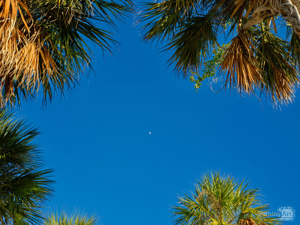 The moon and four palms on tropical Sand Key Beach in Florida